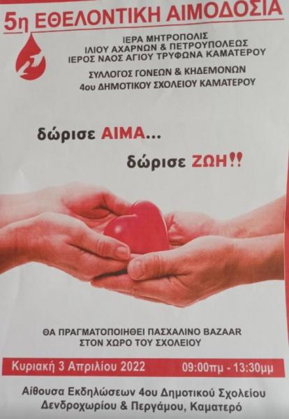 Η 5η ΕΘΕΛΟΝΤΙΚΗ ΑΙΜΟΔΟΣΙΑ διοργανώνεται την Κυριακή 3 Απριλίου 2022, από 9:00-13:30, με τη συμμετοχή του 4ου Δημοτικού Σχολείου Καματερού και της ενορίας του Αγίου Τρύφωνος Καματερού.