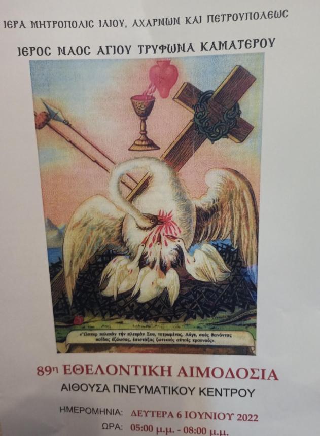 O Ι. Ν. Αγίου Τρύφωνος Καματερού διοργανώνει τη Δευτέρα 6 Ιουνίου 2022 από τις 5 μ.μ. έως τις 8 μ.μ. την 89η εθελοντική αιμοδοσία στο Πνευματικό κέντρο του Ι. Ν. Αγίου Τρύφωνος Καματερού, (Τεπελενίου και Αριστείδου γωνία).