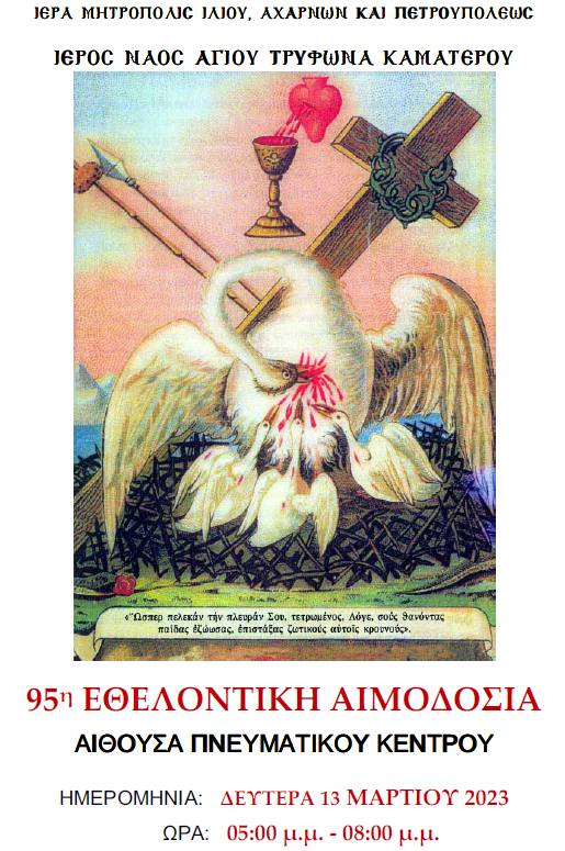 Η ενορία του Αγίου Τρύφωνος Καματερού διοργανώνει τη Δευτέρα 13 Μαρτίου 2023,από τις 5 μ.μ. έως τις 8 μ.μ., την 95η εθελοντική αιμοδοσία στο Πνευματικό Κέντρο του Ιερού Ναού (οδός Τεπελενίου και Αριστείδου γωνία).