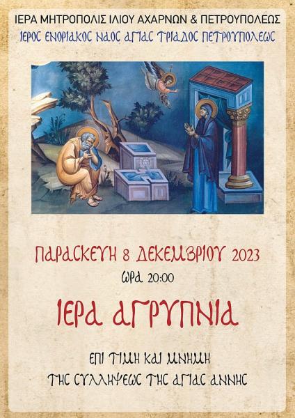 Η ενορία της Αγίας Τριάδος Πετρουπόλεως την Παρασκευή 8 Δεκεμβρίου 2023, θα πραγματοποιήσει Ιερά Αγρυπνία επί τη Συλλήψει της Αγίας Άννης, από 20:00 έως 00:30.