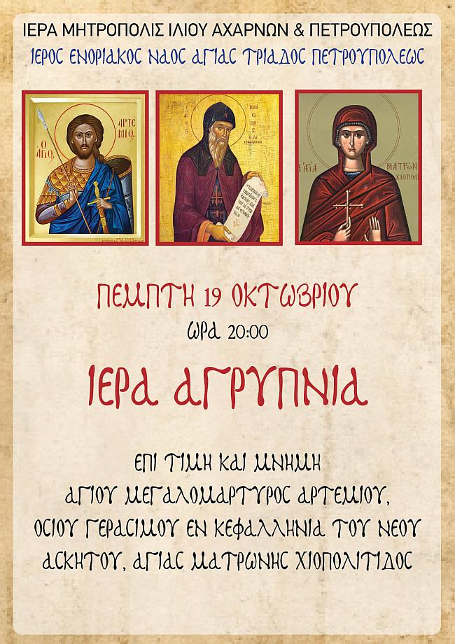 Ιερά αγρυπνία θα τελεστεί στην ενορία της Αγίας Τριάδας Πετρουπόλεως, την Πέμπτη 19 Οκτωβρίου 2023, στις 20:00, επί τη μνήμη των Αγίων Αρτεμίου, Γερασίμου εν Κεφαλληνία και Ματρώνης της Χιοπολίτιδος.