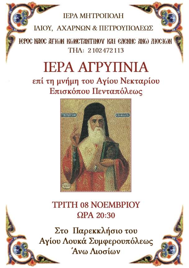 Ιερά αγρυπνία θα τελεστεί στο παρεκκλήσιο του Αγίου Λουκά Αρχιεπισκόπου Συμφερουπόλεως του ιατρού στα Άνω Λιόσια, επί τη μνήμη του Αγίου Νεκταρίου, Επισκόπου Πενταπόλεως, την Τρίτη 8 Νοεμβρίου 2022 στις 20:30.