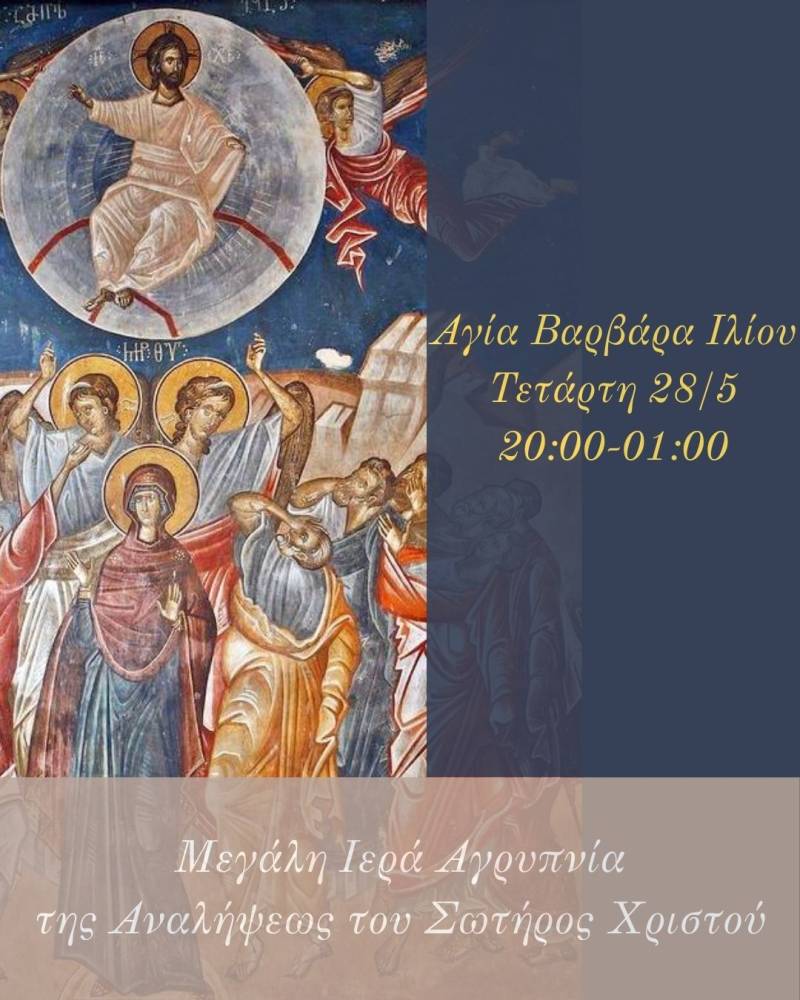 Μεγάλη Ιερά Αγρυπνία θα τελεστεί στον Ιερό Ναό Αγίας Βαρβάρας Ιλίου για την εορτή της Αναλήψεως του Κυρίου και Θεού και Σωτήρος ημών Ιησού Χριστού, την Τετάρτη 28 Μαΐου 2025, από 20:00 έως 01:00 περίπου. Θα ψάλει χορός ιεροψαλτών.