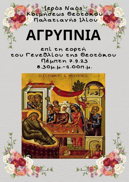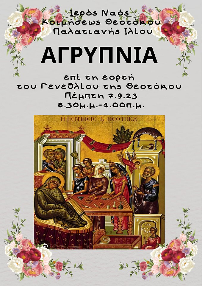Ιερά αγρυπνία θα τελεστεί επί τη εορτή του Γενεθλίου της Θεοτόκου στον Ιερό Ναό Κοιμήσεως της Θεοτόκου Παλατιανής Ιλίου, την Πέμπτη 7 Σεπτεμβρίου 2023, από 20:30 έως 01:00 περίπου.