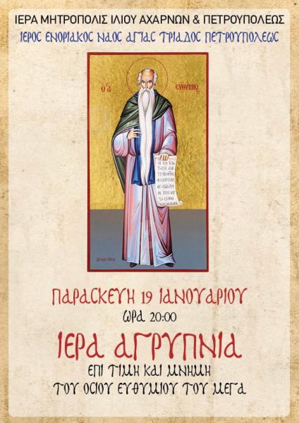 Ιερά αγρυπνία επί τη μνήμη του Οσίου Ευθυμίου του μεγάλου θα πραγματοποιηθεί στην ενορία της Αγίας Τριάδας Πετρουπόλεως, την Παρασκευή 19 Ιανουαρίου 2024, στις 20:00.