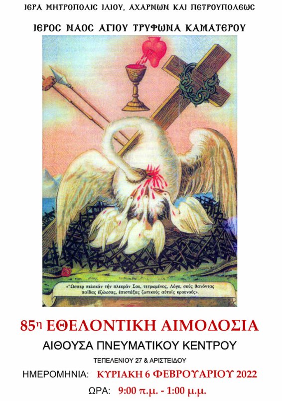 O Ι. Ν. Αγίου Τρύφωνος Καματερού διοργανώνει την Κυριακή 6 Φεβρουαρίου 2022 από τις 9 π.μ. έως τη 1 μ.μ. την 85η εθελοντική αιμοδοσία στο Πνευματικό κέντρο της ενορίας (Τεπελενίου και Αριστείδου γωνία).
