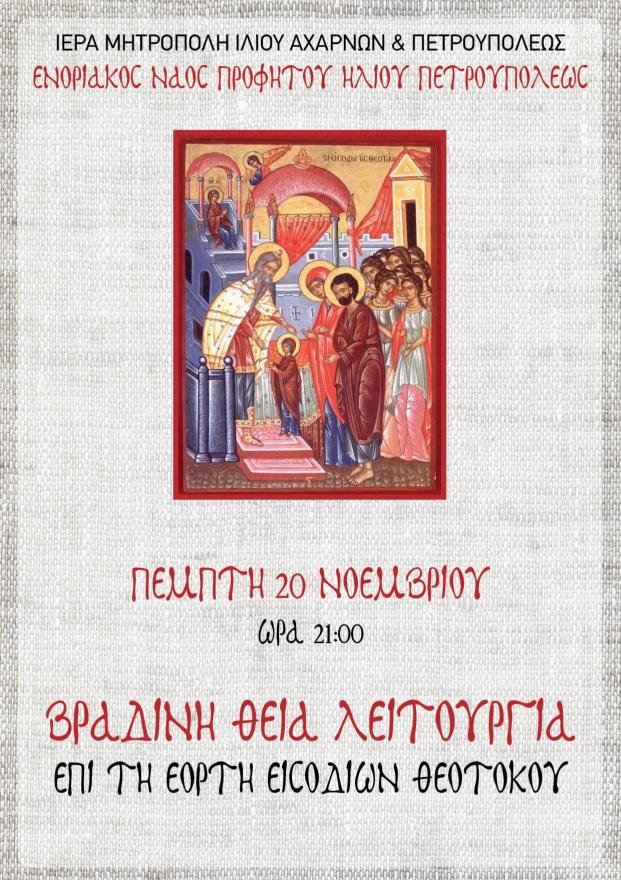 Την Πέμπτη 20 Νοεμβρίου 2025, ώρα 21:00, θα τελεστεί βραδινή Θεία Λειτουργία επί τη εορτή των Εισοδίων της Υπεραγίας ημών Θεοτόκου και Αειπαρθένου Μαρίας, στον Ιερό Ναό Προφήτου Ηλιού Πετρουπόλεως.