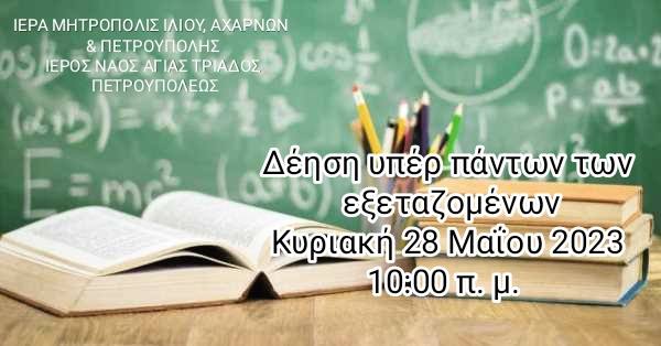 Δέηση προς τον Σωτήρα Χριστό θα τελεστεί στον Ιερό Ενοριακό Ναό Αγίας Τριάδος Πετρουπόλεως, την Κυριακή 28 Μαΐου 2023 στις 10:00π.μ., μετά το πέρας της Θείας Λειτουργίας, υπέρ των μαθητών που συμμετέχουν στις Πανελλαδικές εξετάσεις και πάντων των εξεταζομένων.