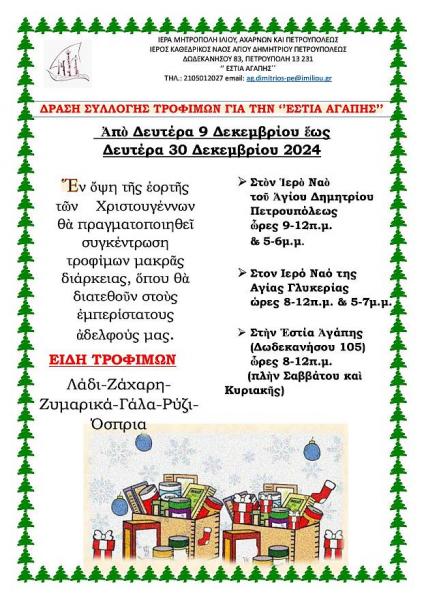 Εν όψει της εορτής των Χριστουγέννων η «Εστία Αγάπης» της ενορίας Αγίου Δημητρίου Πετρουπόλεως θα πραγματοποιήσει συγκέντρωση τροφίμων μακράς διαρκείας, από 9 έως 30 Δεκεμβρίου 2024, τα οποία θα διατεθούν στους εμπερίστατους αδελφούς μας.