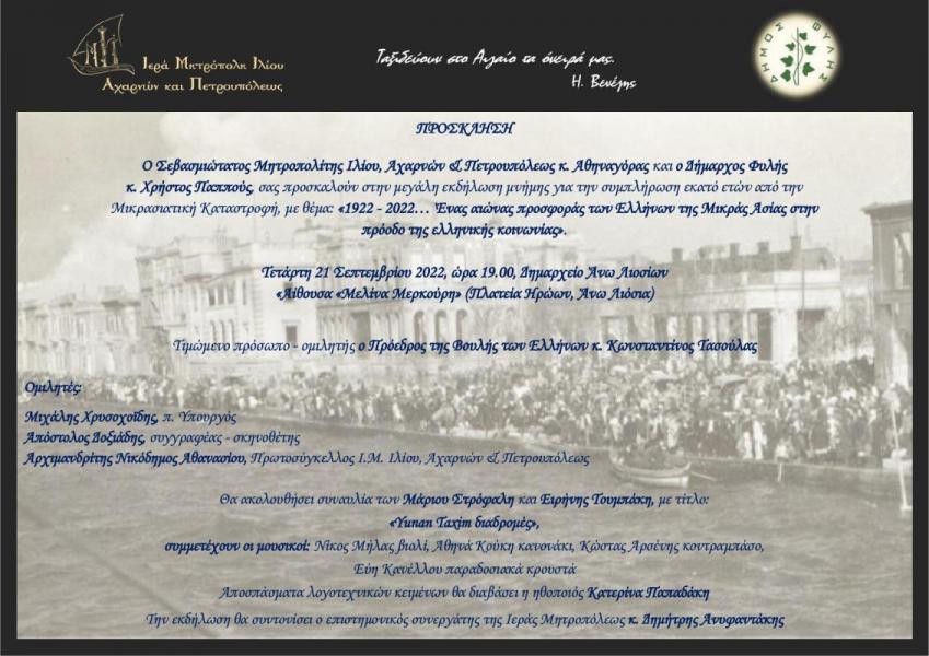 Ο Σεβασμιώτατος Μητροπολίτης Ιλίου, Αχαρνών και Πετρουπόλεως κ. Αθηναγόρας και ο Δήμαρχος Φυλής κ. Χρήστος Παππούς σας προσκαλούν στην μεγάλη εκδήλωση μνήμης για την συμπλήρωση εκατό ετών από τη Μικρασιατική καταστροφή, με θέμα: «1922-2022... Ένας αιώνας προσφοράς των Ελλήνων της Μικράς Ασίας στην πρόοδο της ελληνικής κοινωνίας».
