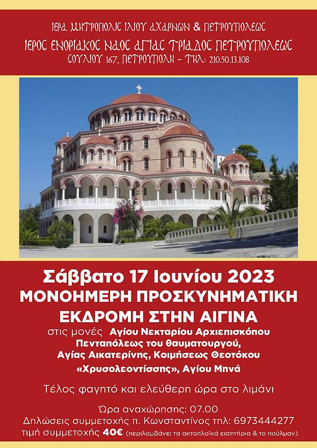 Μονοήμερη προσκυνηματική εκδρομή στην Αίγινα και στις Ιερές Μονές Αγίου Νεκταρίου Αρχιεπισκόπου Πενταπόλεως, Κοιμήσεως Θεοτόκου «Χρυσολεοντίσσης» και Αγίου Μηνά θα πραγματοποιήσει η ενορία της Αγίας Τριάδας Πετρουπολεως, το Σάββατο 17 Ιουνίου 2023.