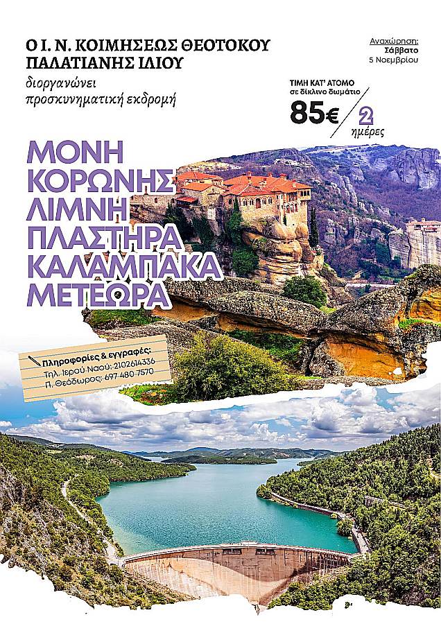 Διήμερη εκδρομή στη Μονή Κορώνης, τη Λίμνη Πλαστήρα, την Καλαμπάκα και τα Μετέωρα διοργανώνει η ενορία Κοιμήσεως Θεοτόκου Παλατιανής Ιλίου, στις 5 και 6 Νοεμβρίου 2022.
