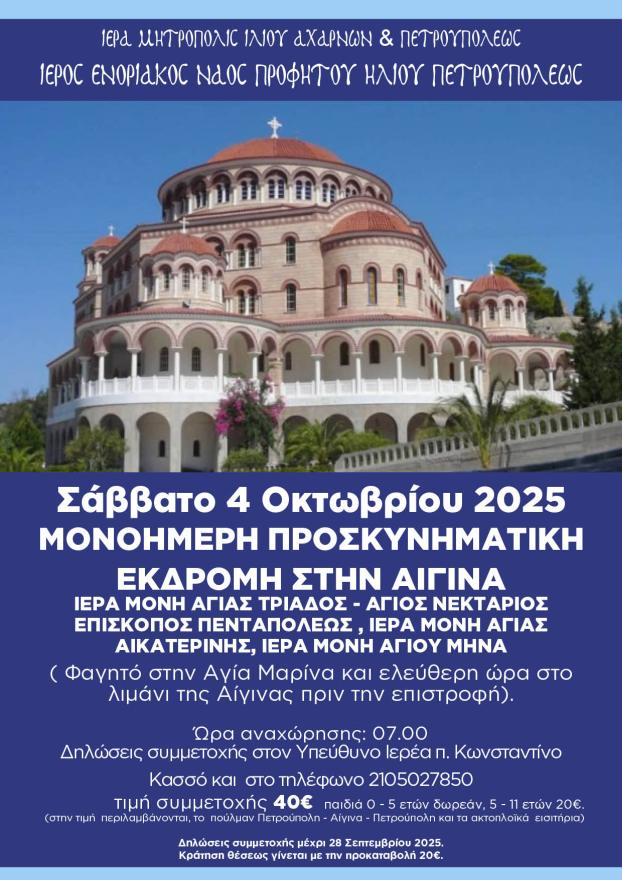 Ἡ Ἐνορία τοῦ Προφήτου Ἠλιοῦ Πετρουπόλεως πραγματοποιεῖ μονοήμερη προσκυνηματικὴ ἐκδρομὴ στὸ νησὶ τῆς Αἰγίνης, στὸν Ἅγιο Νεκτάριο τὸν Θαυματουργό, σὺμφωνα μὲ τὸ ἀκόλουθο πρόγραμμα, τὸ Σάββατο 4 Ὀκτωβρίου 2025.