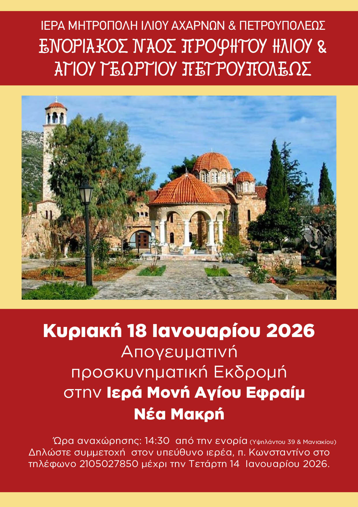 Ἡ Ἐνορία τοῦ Προφήτου Ἠλιοῦ Πετρουπόλεως, σᾶς προσκαλεῖ στὴν ἀπογευματινὴ προσκυνηματικὴ ἐκδρομὴ στήν Ἱερὰ Μονὴ Ἁγίου Ἐφραὶμ Νέας Μάκρης, την Κυριακὴ 18 Ἰἀνουαρίου 2026, ὲ μὥρα ἀναχώρησης 14:30, ἀπὸ τὴν Ἐνορία (Ὑψηλάντου 39 & Μανιακίου).