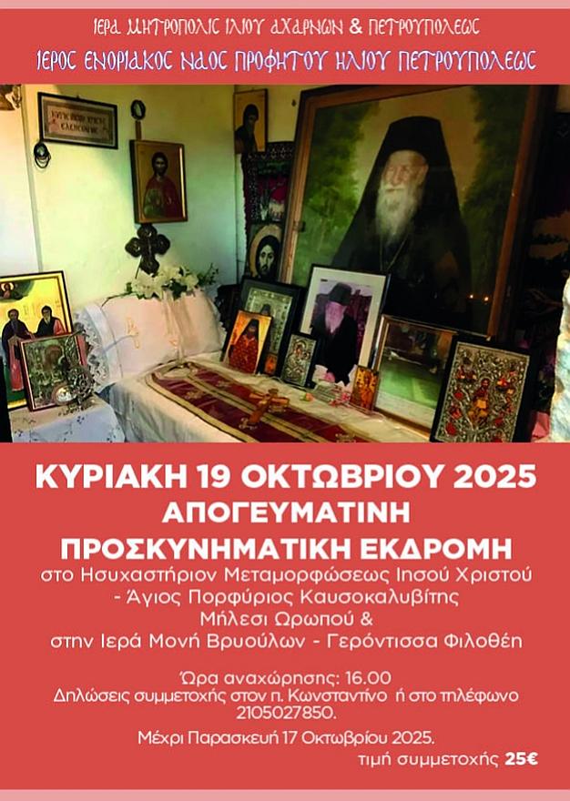 Ἡ Ἐνορία Προφήτου Ἠλιοῦ Πετρουπόλεως θὰ πραγματοποιήσει ἀπογευματινὴ προσκυνηματικὴ ἐκδρομὴ στὸ Ἱερὸν Ἡσυχαστήριον Μεταμορφώσεως Σωτῆρος Χριστοῦ - Ἁγίου Πορφυρίου Καυσοκαλυβίτου, στὸ Μήλεσι Ὠρωποῦ καὶ στὴν Ἱερὰ Μὸνὴ Βρυούλων - Γερόντισσα Φιλοθέη.