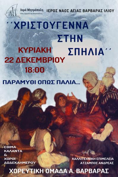 Η χορευτική ομάδα παραδοσιακών χορών και λαογραφίας της ενορίας της Αγίας Βαρβάρας Ιλίου διηγείται ένα ΠΑΡΑΜΥΘΙ ΟΠΩΣ ΠΑΛΙΑ: «Χριστούγεννα στη σπηλιά» του Φώτη Κόντογλου, διανθισμένο με κάλαντα, τραγούδια και χορούς των ημερών των Χριστουγέννων από άκρη σε άκρη της Ελλάδας!