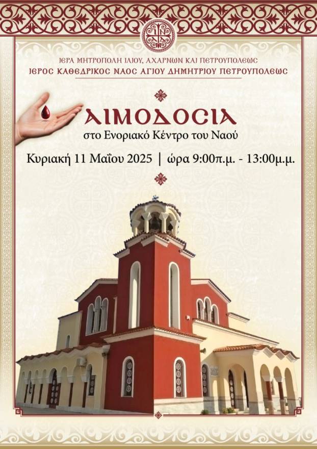 Εθελοντική αιμοδοσία θα πραγματοποιηθεί στο Ενοριακό Κέντρο του Ιερού Ναού Αγίου Δημητρίου Πετρουπόλεως την Κυριακή 11 Μαΐου 2025, από 09:00 έως 13:00.