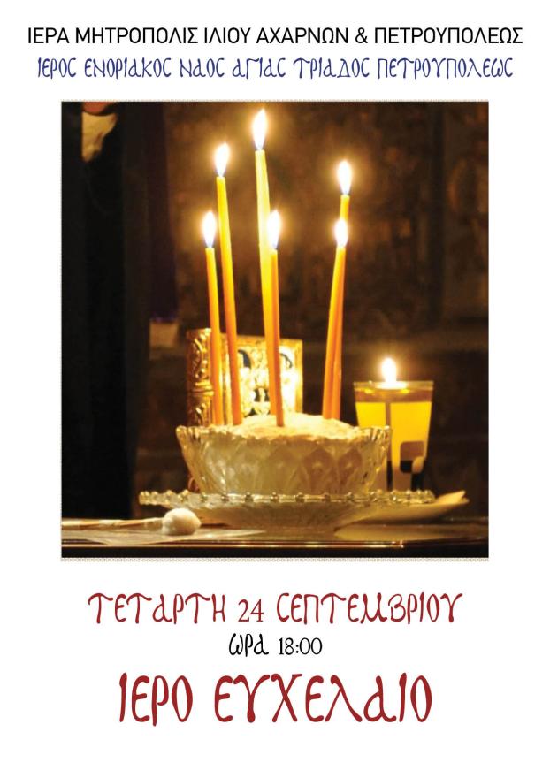 Το μυστήριο του Ευχελαίου θα τελεστεί στον Ιερό Ναό Αγίας Τριάδος Πετρουπόλεως την Τετάρτη 24 Σεπτεμβρίου 2025, στις 18:00.