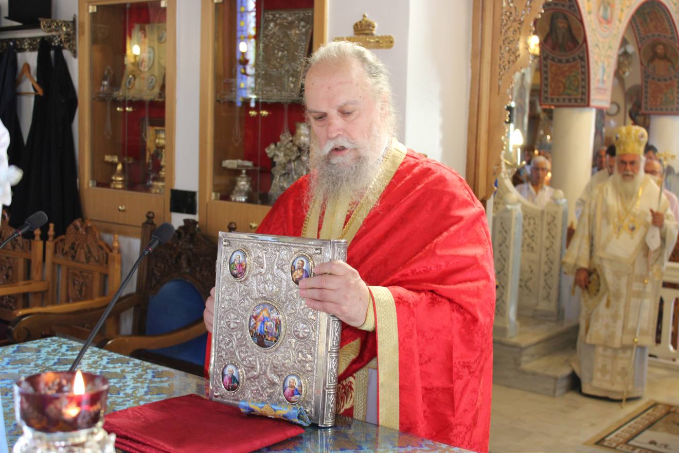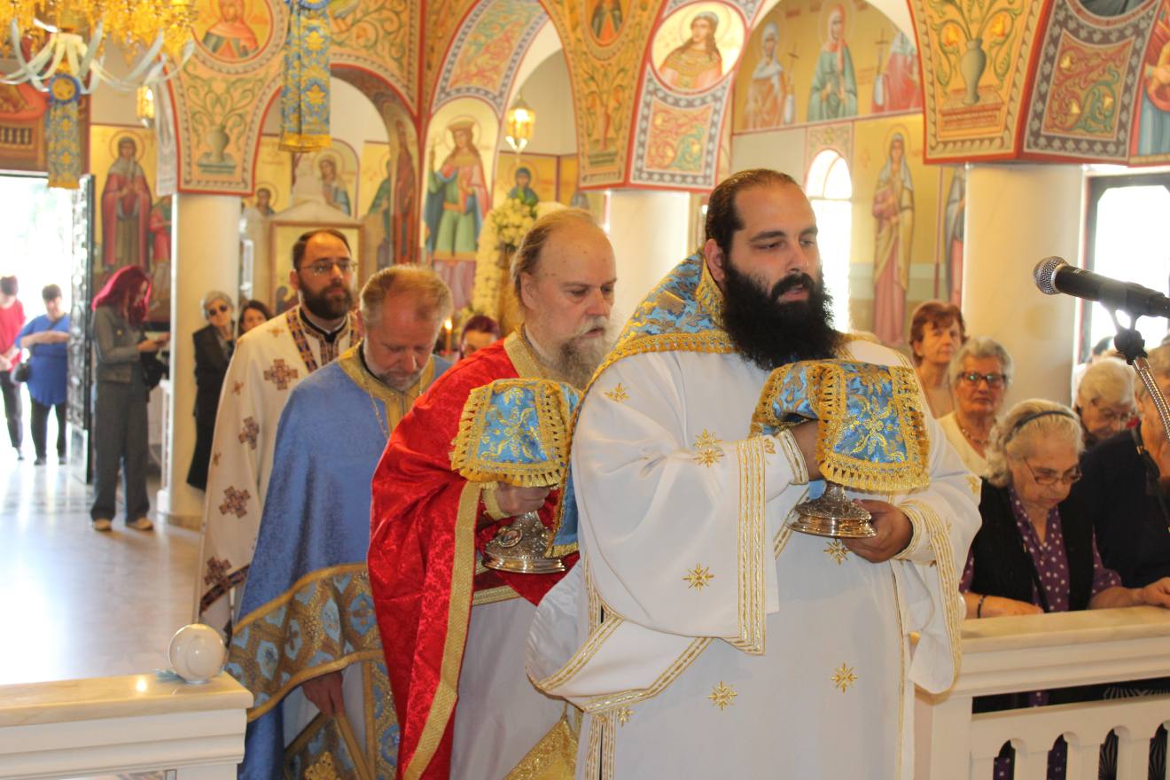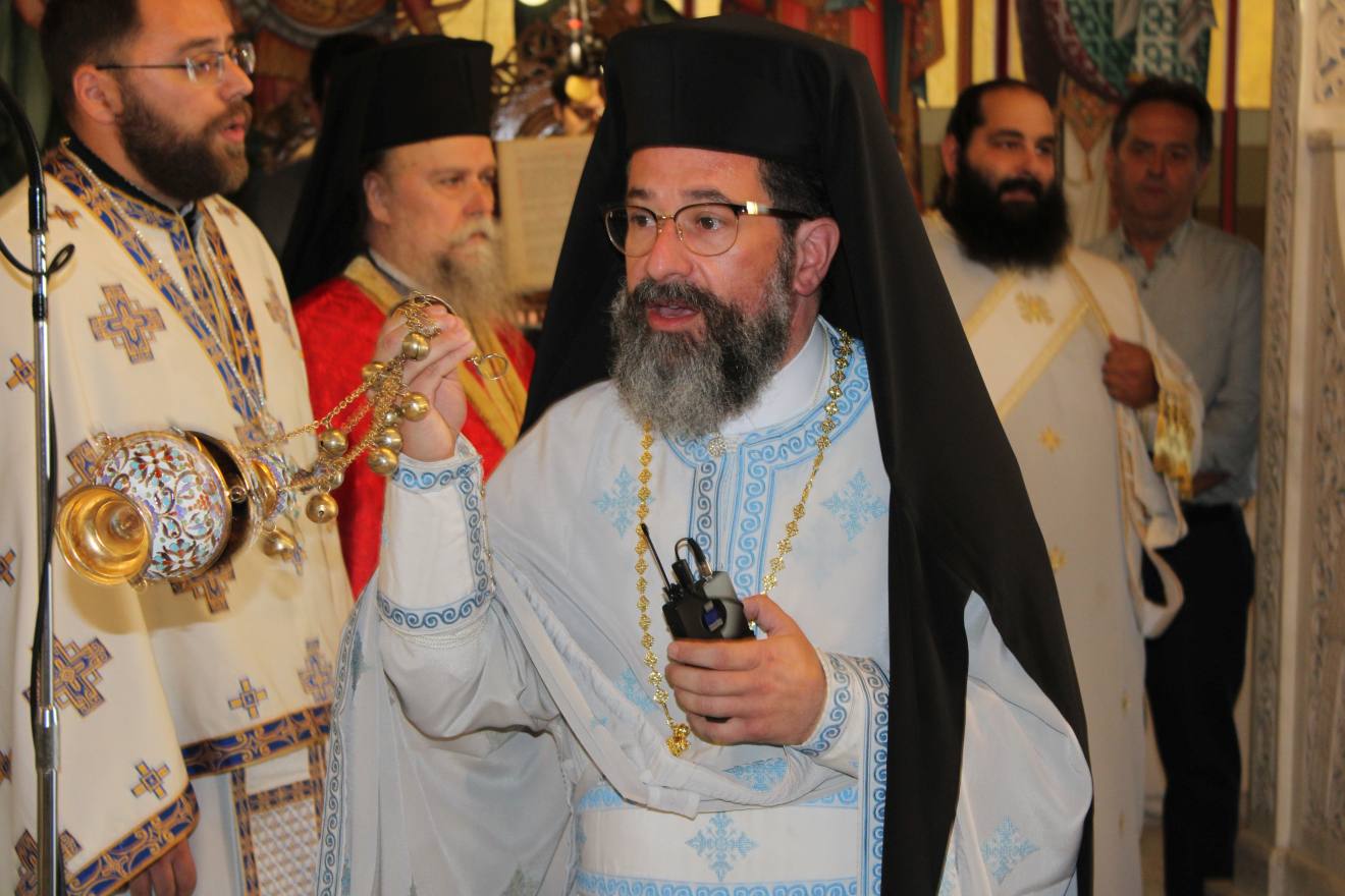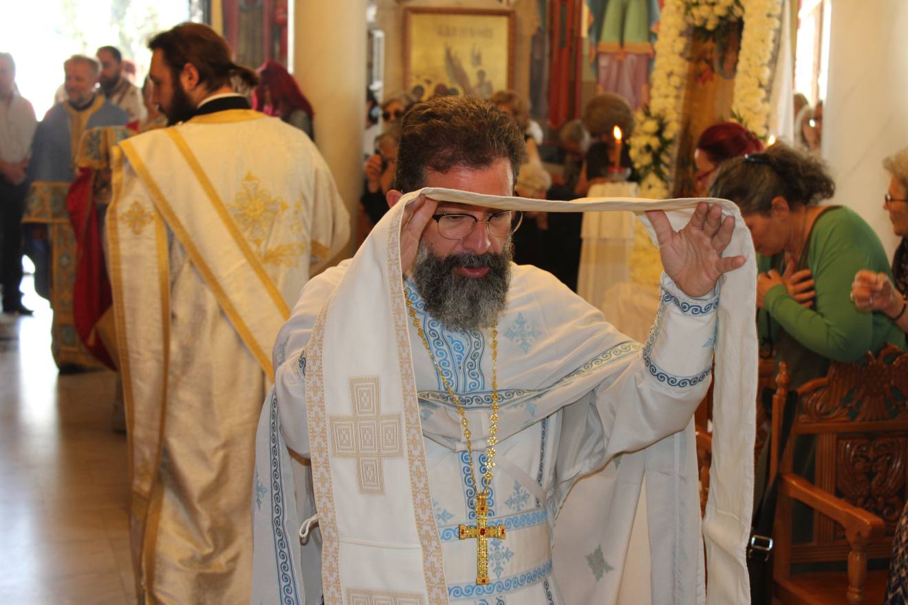 Ήταν συμπαραστατούμενος από τους Αρχιμανδρίτες Ιωάννη Ράπτη - Γενικό Αρχιερατικό Επίτροπο της Ιεράς Μητροπόλεως, Αγαθάγγελλο Κόκλα - Ιεροκήρυκα της Ιεράς Μητροπόλεως, ο οποίος ομίλησε κατάλληλα για το νόημα της εορτής, τους πατέρες Κωνσταντίνο Λαμπρόπουλο - Πρόεδρο του Εκκλ. Συμβ. του Ιερού Ναού, Διονύσιο Λαμπρόπουλο και τους διακόνους του π. Άγγελο Μιχαλόπουλο και π. Νεκτάριο Τριβέλα.