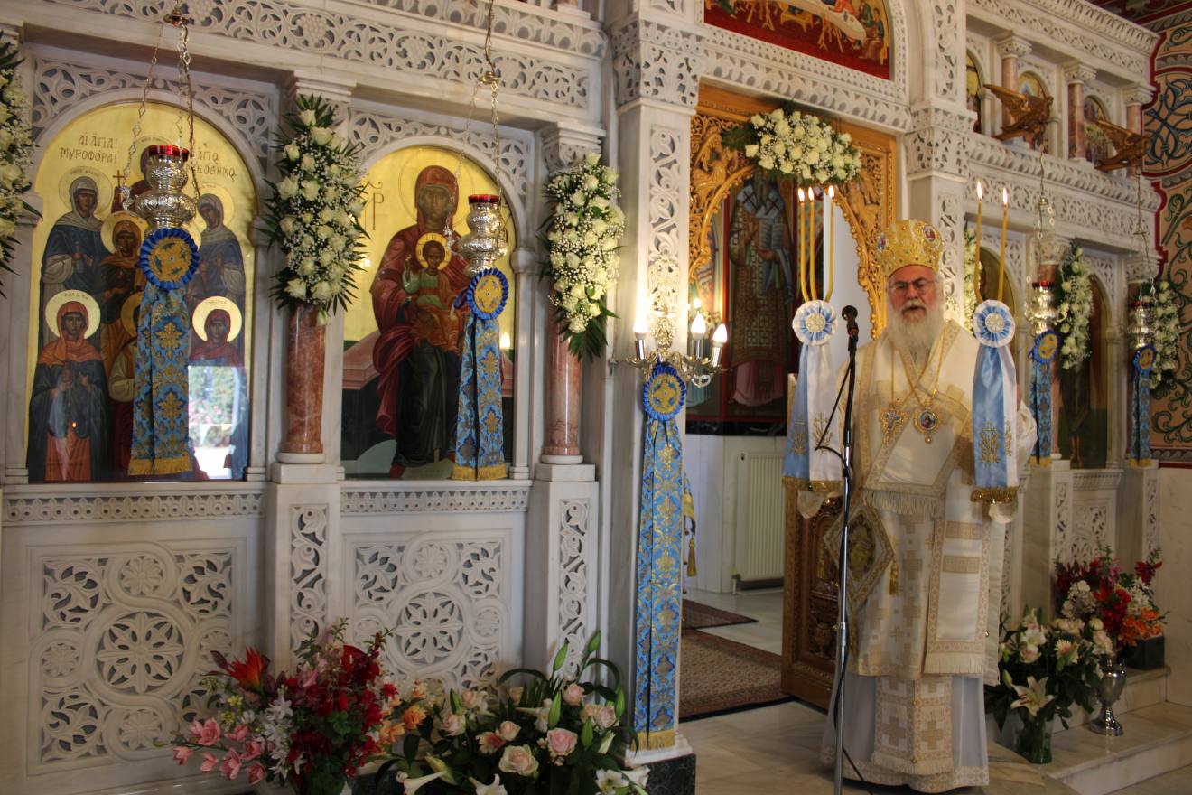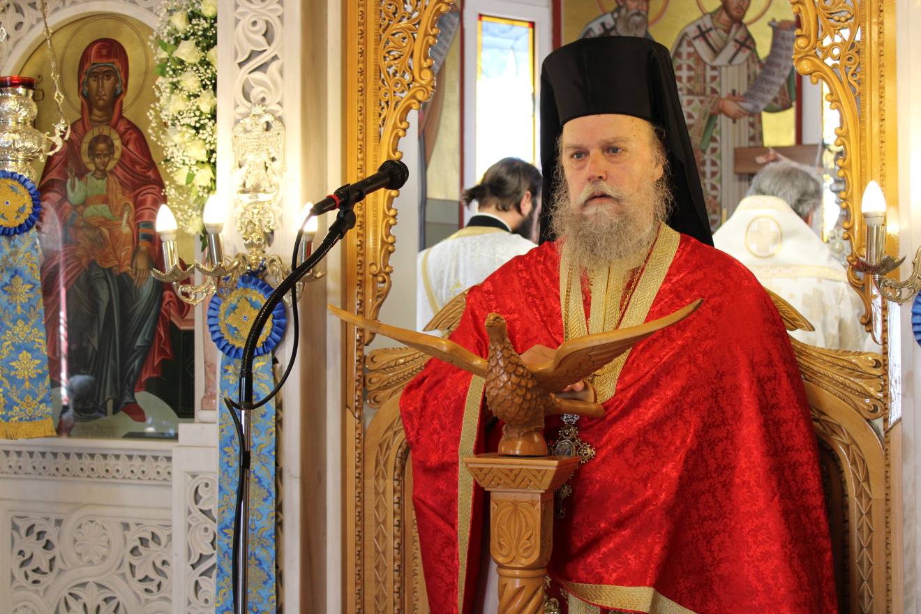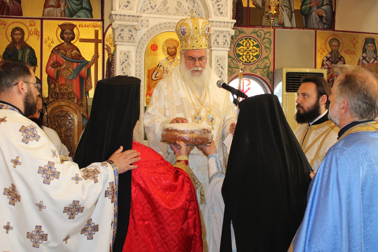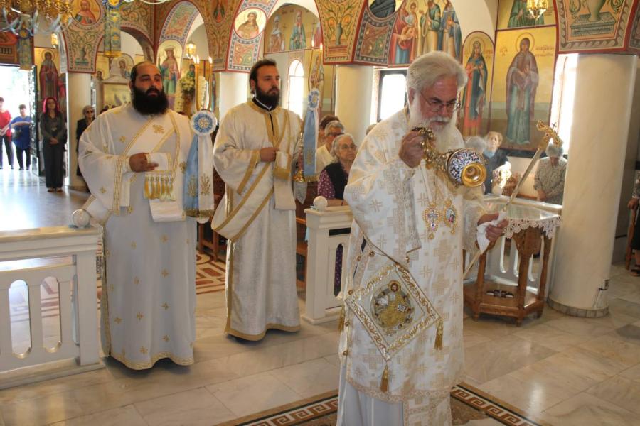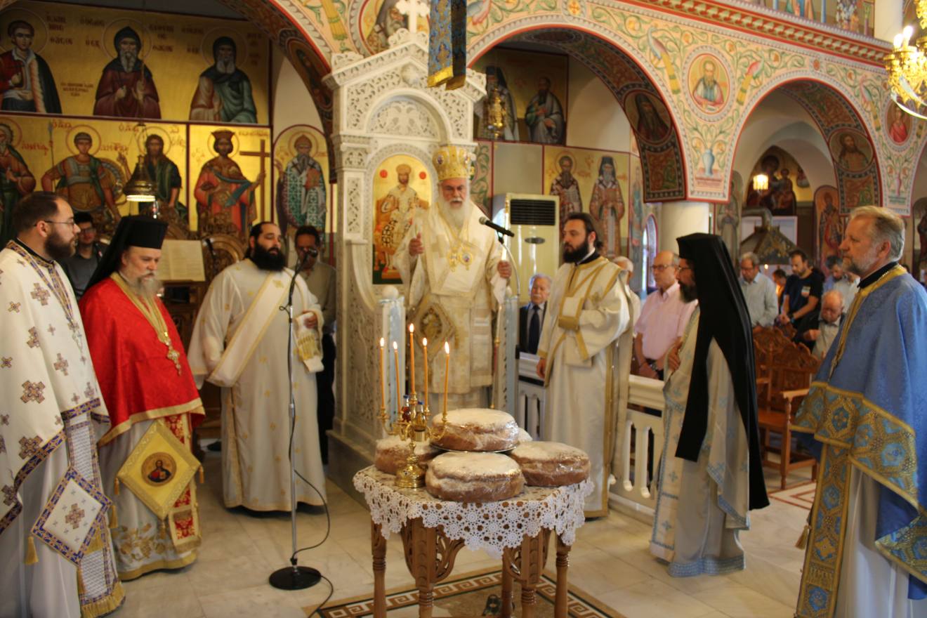 Ήταν συμπαραστατούμενος από τους Αρχιμανδρίτες Ιωάννη Ράπτη - Γενικό Αρχιερατικό Επίτροπο της Ιεράς Μητροπόλεως, Αγαθάγγελλο Κόκλα - Ιεροκήρυκα της Ιεράς Μητροπόλεως, ο οποίος ομίλησε κατάλληλα για το νόημα της εορτής, τους πατέρες Κωνσταντίνο Λαμπρόπουλο - Πρόεδρο του Εκκλ. Συμβ. του Ιερού Ναού, Διονύσιο Λαμπρόπουλο και τους διακόνους του π. Άγγελο Μιχαλόπουλο και π. Νεκτάριο Τριβέλα.