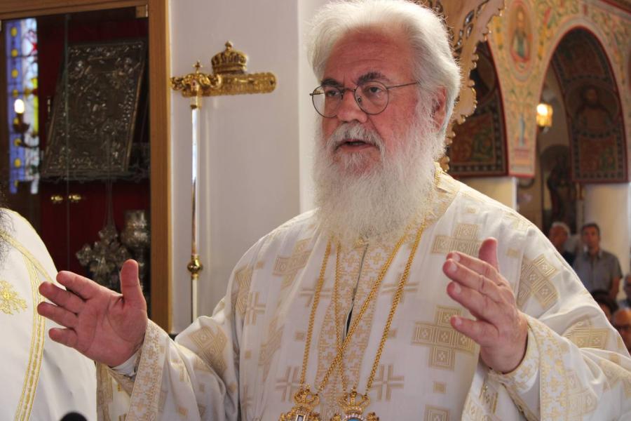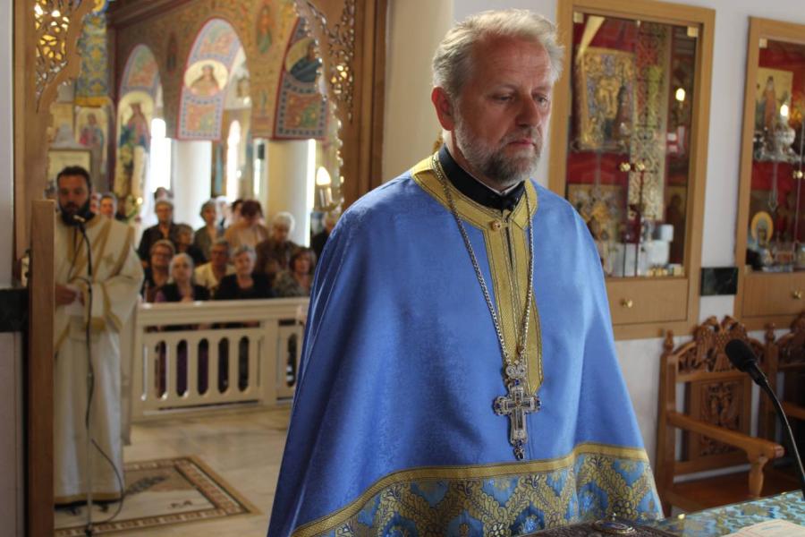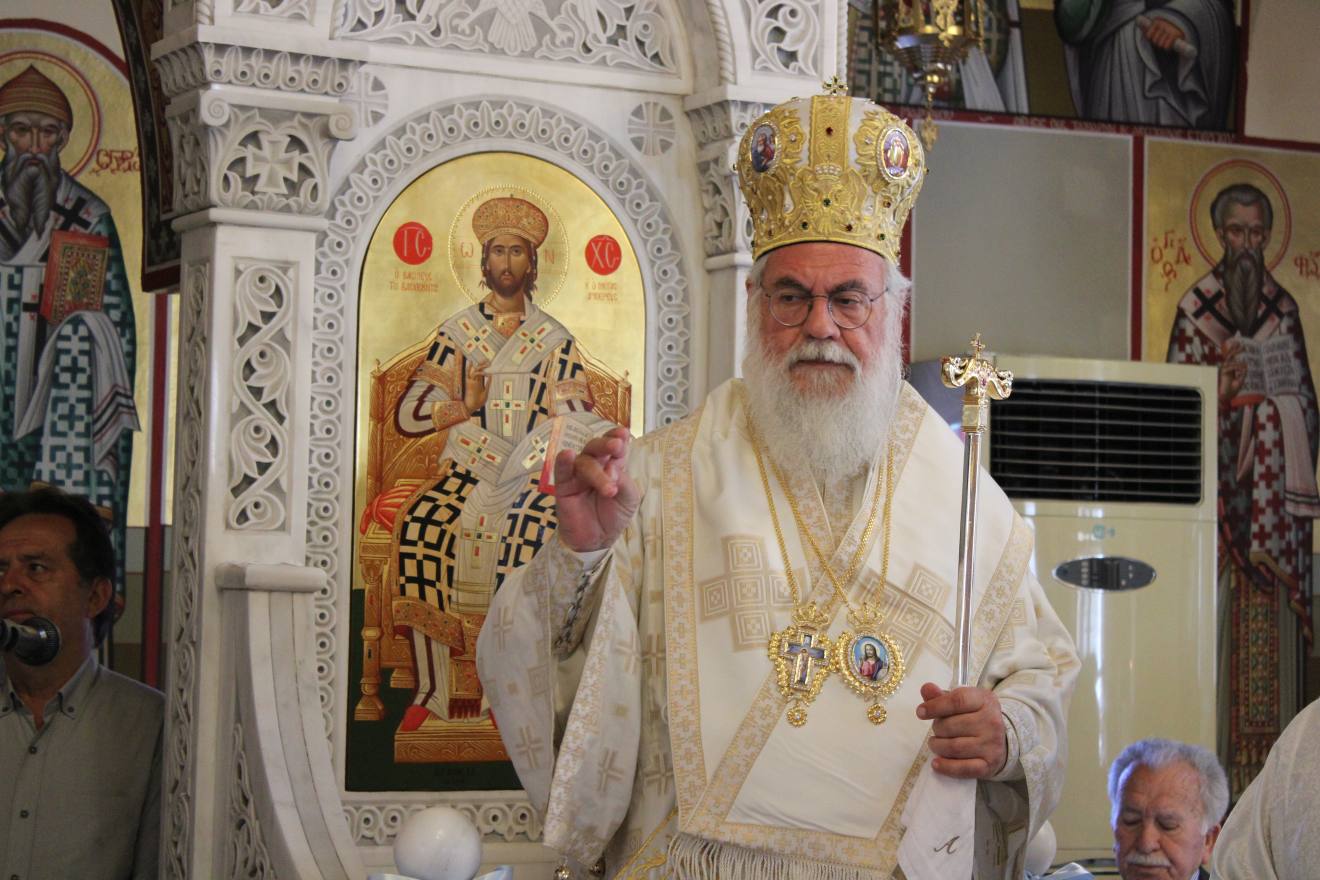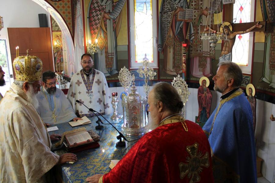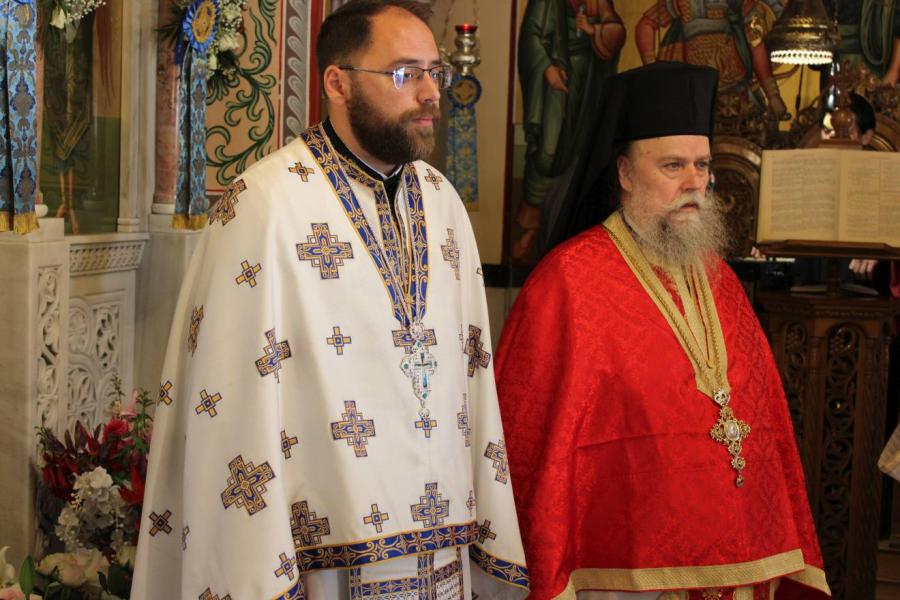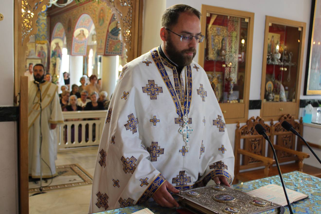 Ήταν συμπαραστατούμενος από τους Αρχιμανδρίτες Ιωάννη Ράπτη - Γενικό Αρχιερατικό Επίτροπο της Ιεράς Μητροπόλεως, Αγαθάγγελλο Κόκλα - Ιεροκήρυκα της Ιεράς Μητροπόλεως, ο οποίος ομίλησε κατάλληλα για το νόημα της εορτής, τους πατέρες Κωνσταντίνο Λαμπρόπουλο - Πρόεδρο του Εκκλ. Συμβ. του Ιερού Ναού, Διονύσιο Λαμπρόπουλο και τους διακόνους του π. Άγγελο Μιχαλόπουλο και π. Νεκτάριο Τριβέλα.