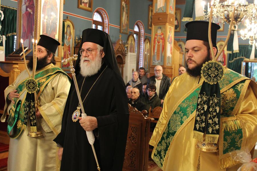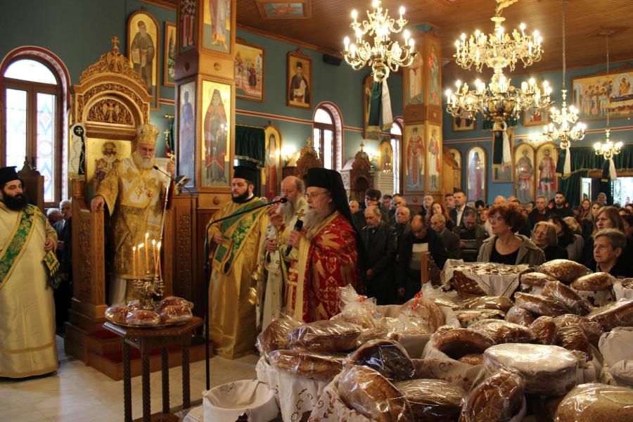 Στο τέλος της Θείας Λειτουργίας ο Σεβασμιώτατος τέλεσε την ακολουθία της αρτοκλασίας και ευλόγησε τα κόλλυβα του Αγίου.