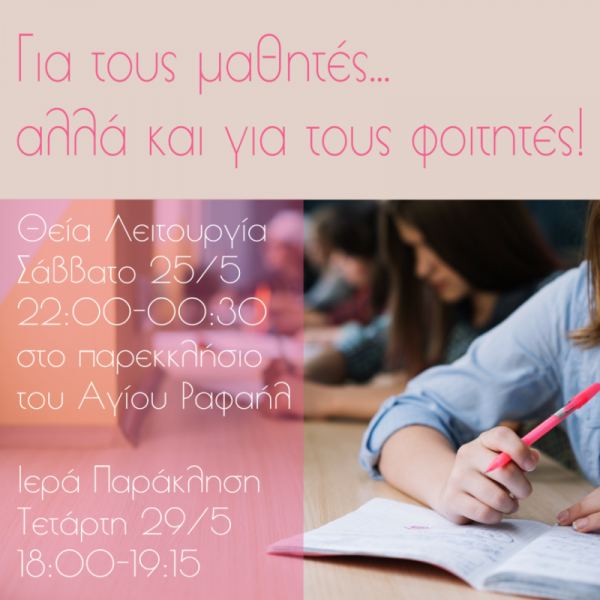 Μαζί με όλες τις ευχές μας, προτείνουμε στους μαθητές και τους φοιτητές που προετοιμάζονται για τις εξετάσεις τους να συμμετάσχουν στη Θεία Λειτουργία ή την Ιερά Παράκληση που θα τελεστεί ειδικά για εκείνους.