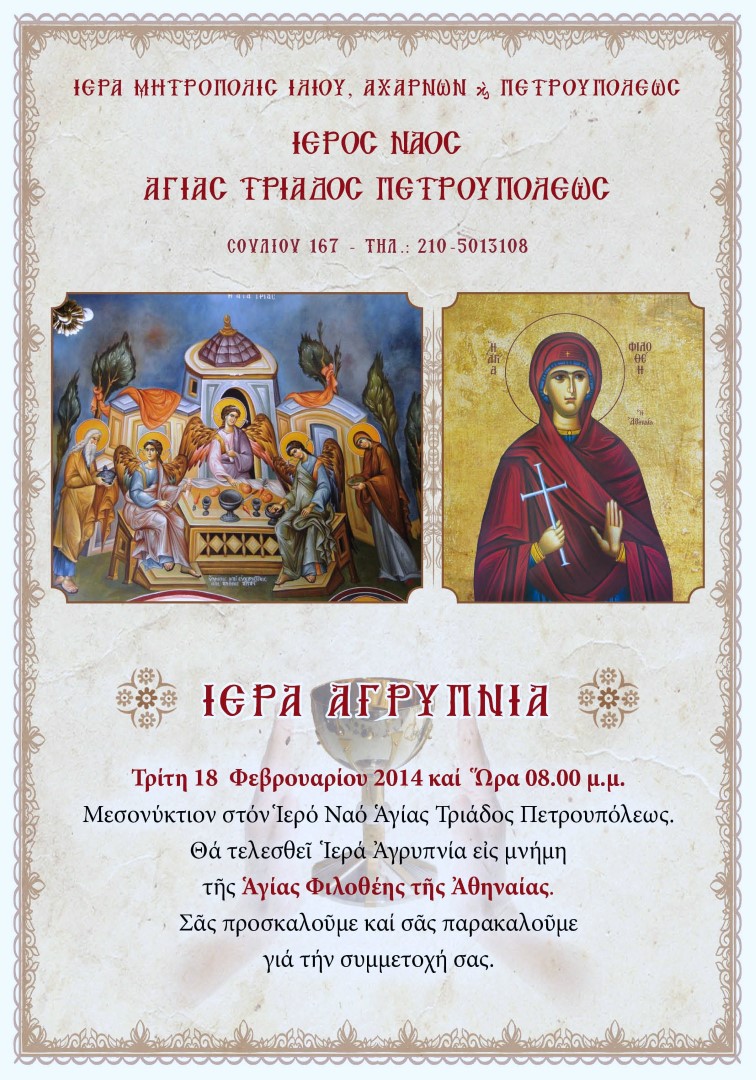 Αγρυπνία Αγίας Φιλοθέης στην Αγ. Τριάδα Πετρ.