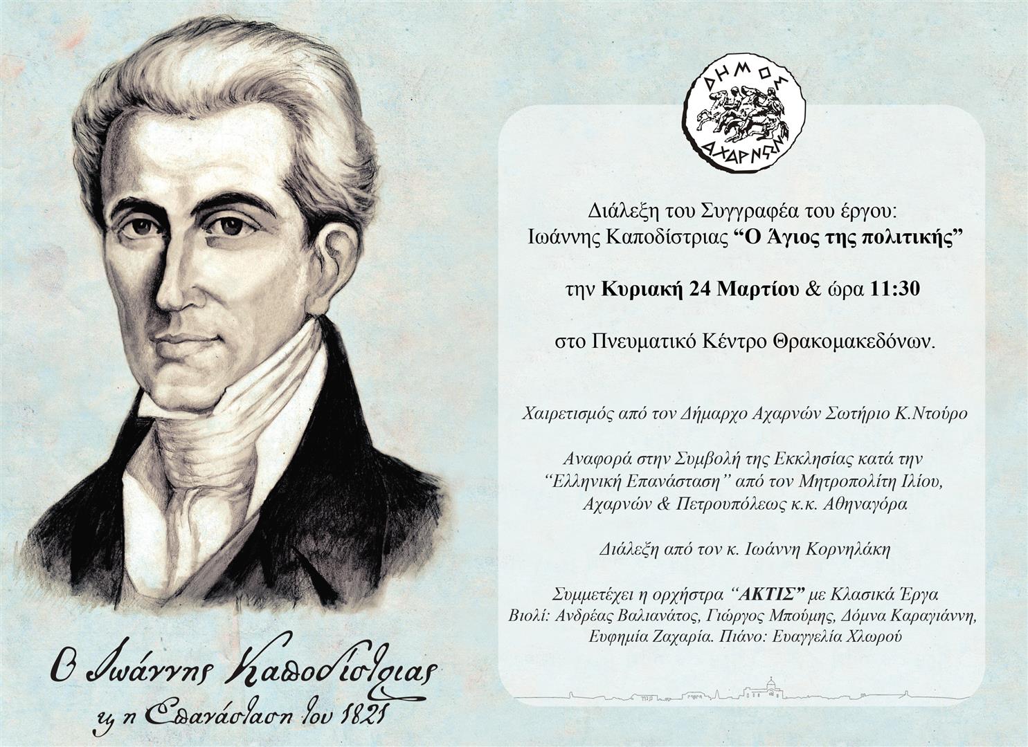 Διάλεξη «Ο άγιος της πολιτικής» για τον Ιωάννη Καποδίστρια