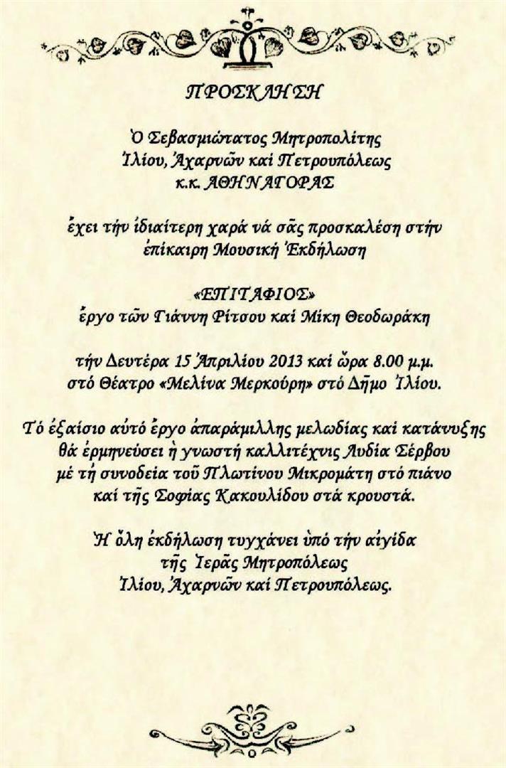 Μουσική εκδήλωση: «Επιτάφιος», των Γ. Ρίτσου, Μ. Θεοδωράκη