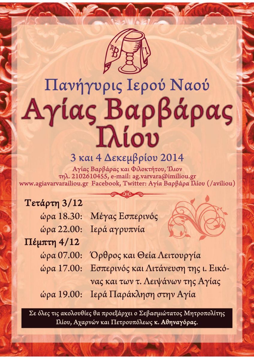 Οι ιερείς, το εκκλησιαστικό συμβούλιο και όλοι οι ενορίτες του Ι. Ν. Αγίας Βαρβάρας Ιλίου έχουμε την τιμή να σας προσκαλέσουμε στην πανήγυρη της μνήμης της προστάτιδός μας.