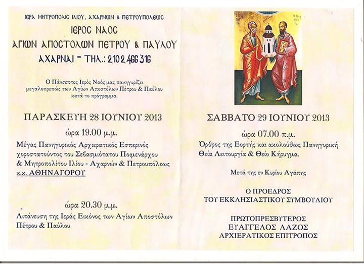 Πανήγυρις Ι.Ν. Αγίων Αποστόλων Αχαρνών