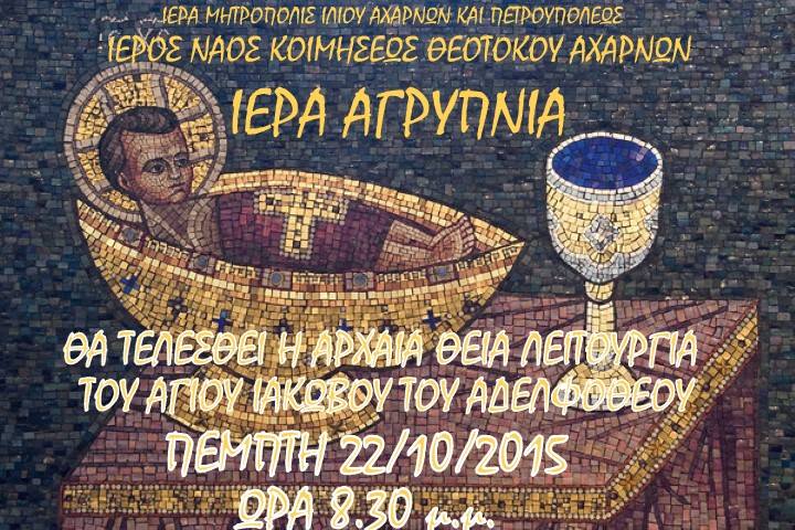 Ιερά αγρυπνία με τέλεση της αρχαιοπρεπούς Θείας Λειτουργίας του Αγ. Ιακώβου του αδελφοθέου, την Πέμπτη 22/10, στις 20:30, στον Ι.Ν. Κοιμήσεως Θεοτόκου Αχαρνών.