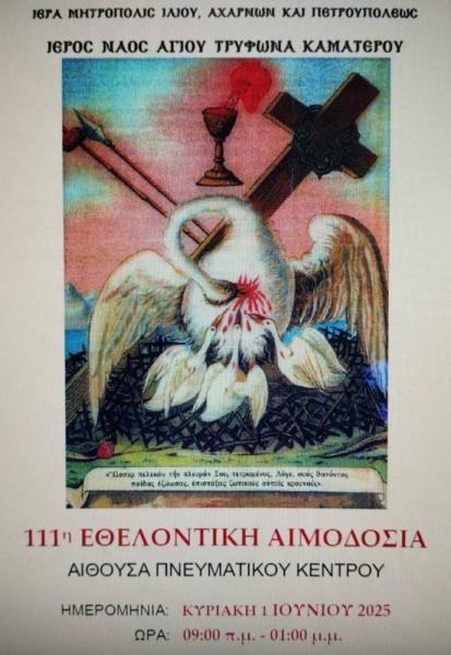 Η ενορία του Αγίου Τρύφωνος Καματερού διοργανώνει την Κυριακή 1 Ιουνίου 2025 από τις 9:00 π.μ. έως τη 1:00 μ.μ. την 110η εθελοντική αιμοδοσία στο Πνευματικό κέντρο του Ι. Ν. Αγίου Τρύφωνος Καματερού, (Τεπελενίου και Αριστείδου γωνία).