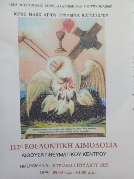 O Ι. Ν. Αγίου Τρύφωνος Καματερού διοργανώνει την Κυριακή 6 Ιουλίου 2025 από τις 9:00π.μ. έως τη 1:00 μ.μ. την 112η εθελοντική αιμοδοσία στο Πνευματικό Κέντρο του Ι. Ν. Αγίου Τρύφωνος Καματερού, (Τεπελενίου και Αριστείδου γωνία).
