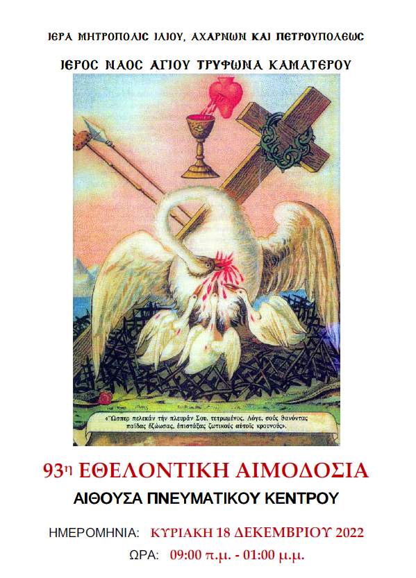 Την Κυριακή 18 Δεκεμβρίου 2022 θα πραγματοποιηθεί η 93η εθελοντική αιμοδοσία στην αίθουσα του Πνευματικού Κέντρου της ενορίας του Αγίου Τρύφωνος Καματερού, από 9 π.μ. έως 1 μ.μ.