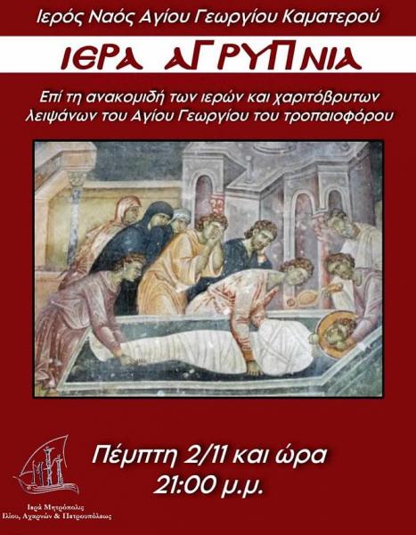 Ιερά αγρυπνία επί τη ανακομιδή των λειψάνων του Αγίου Γεωργίου του Τροπαιοφόρου θα τελεστεί στον Ιερό Ναό Αγίου Γεωργίου Καματερού την Πέμπτη 2 Νοεμβρίου 2023, από τις 21:00.