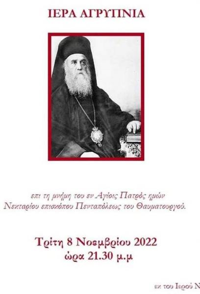 Ιερά αγρυπνία θα τελεστεί στον Ιερό Ναό Αγίου Γεωργίου Καματερού την Τρίτη 8 Νοεμβρίου 2022, στις 21:30, επί τη μνήμη του Αγίου Νεκταρίου, Επισκόπου Πενταπόλεως.