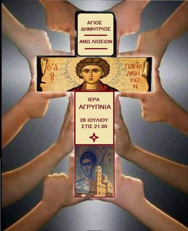 Ιερά αγρυπνία θα τελεστεί στην ενορία του Αγίου Δημητρίου Άνω Λιοσίων, επί τη εορτή του Αγίου ενδόξου Μεγαλομάρτυρος Παντελεήμονος του ιαματικού.