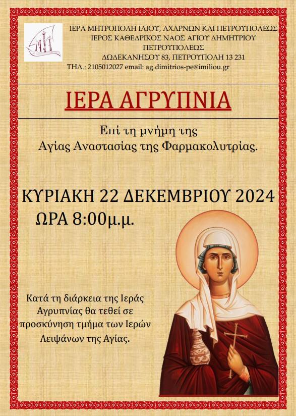 Ιερά αγρυπνία επί τη μνήμη της Αγίας Αναστασίας της φαρμακολύτριας θα τελεστεί στην ενορία του Αγίου Δημητρίου Πετρουπόλεως, την Κυριακή 22 Δεκεμβρίου 2024, στις 20:00.