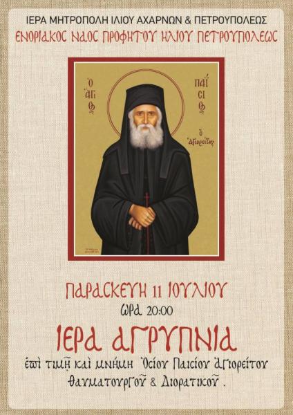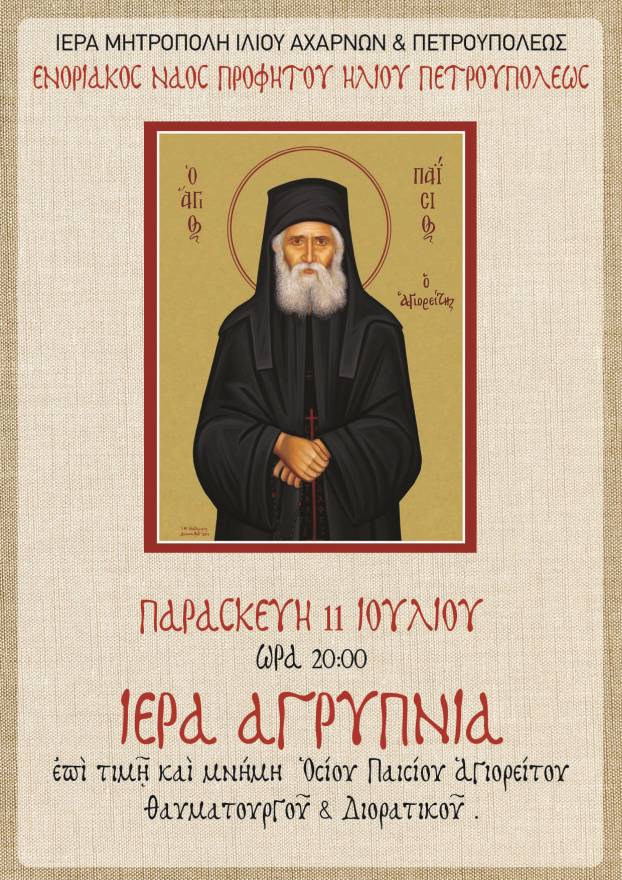 Ιερά αγρυπνία επί τιμή και μνήμη του Οσίου Παϊσίου του Αγιορείτου, του θαυματουργού και διορατικού θα τελεστεί στον Ιερό Ναό Προφήτου Ηλιού Πετρουπόλεως, την Παρασκευή 11 Ιουλίου 2025, στις 20:00.