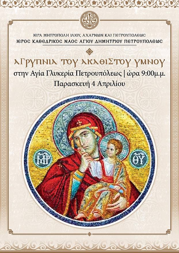 Αγρυπνία του Ακαθίστου Ύμνου θα τελεστεί στον Ιερό Ναό Αγίας Γλυκερίας Πετρουπόλεως, την Παρασκευή 4 Απριλίου 2025, στις 21:00.