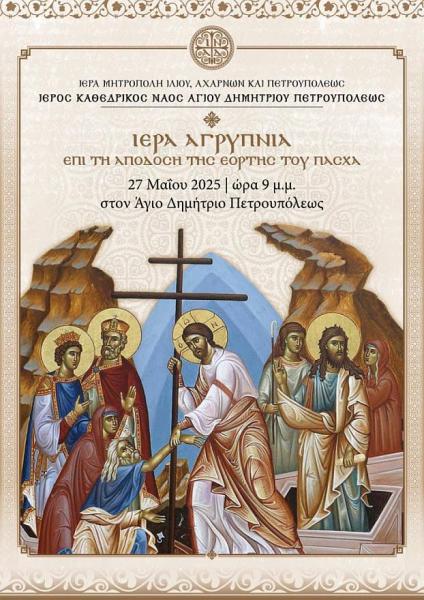 Ιερά αγρυπνία επί τη αποδόσει της εορτής του Πάσχα θα τελεστεί στον Ιερό Ναό Αγίου Δημητρίου Πετρουπόλεως, την Τρίτη 27 Μαΐου 2025, στις 21:00.