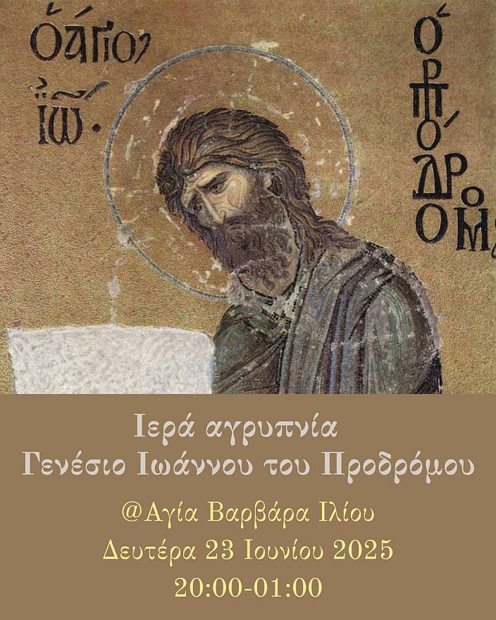 Ιερά αγρυπνία επί τη εορτή του Γενεσίου του Ιωάννου του Προδρόμου θα τελεστεί στον Ιερό Ναό Αγίας Βαρβάρας Ιλίου την Δευτέρα 23 Ιουνίου 2025, από 20:00 έως 01:00 περίπου.