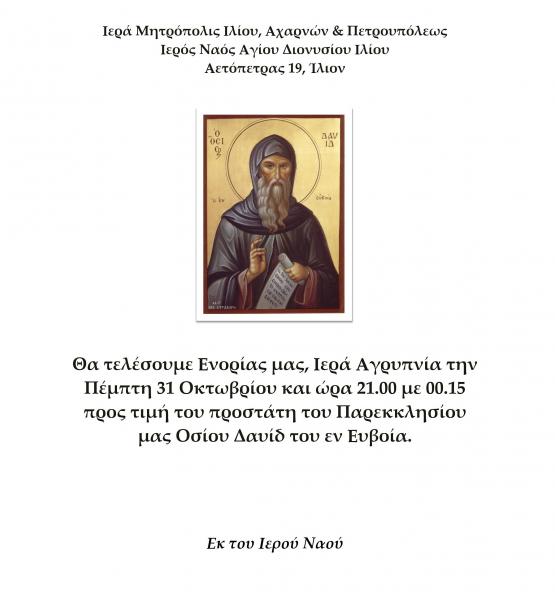 Ιερά αγρυπνία θα τελεστεί στον Ιερό Ναό Αγίου Διονυσίου Ιλίου επί τη μνήμη του Οσίου Δαυίδ του εν Ευβοία, στον οποίο τιμάται το παρεκκλήσιο του Ιερού Ναού, την Πέμπτη 31 Οκτωβρίου 2024, από 21:00 έως 00:15 περίπου.