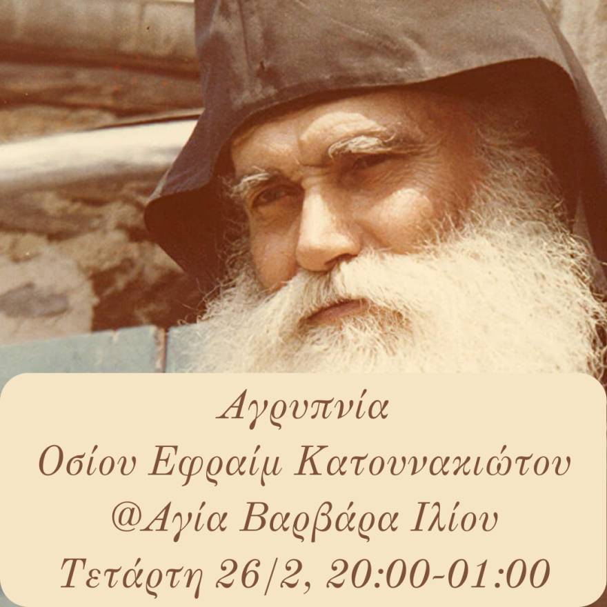 Αγρυπνία επί τη μνήμη του Οσίου Εφραίμ του Κατουνακιώτου θα τελεστεί στον Ι.Ν. Αγίας Βαρβάρας Ιλίου, την Τετάρτη 26/2, από 20:00 έως 01:00 περίπου. Θα ψάλει χορός ιεροψαλτών.