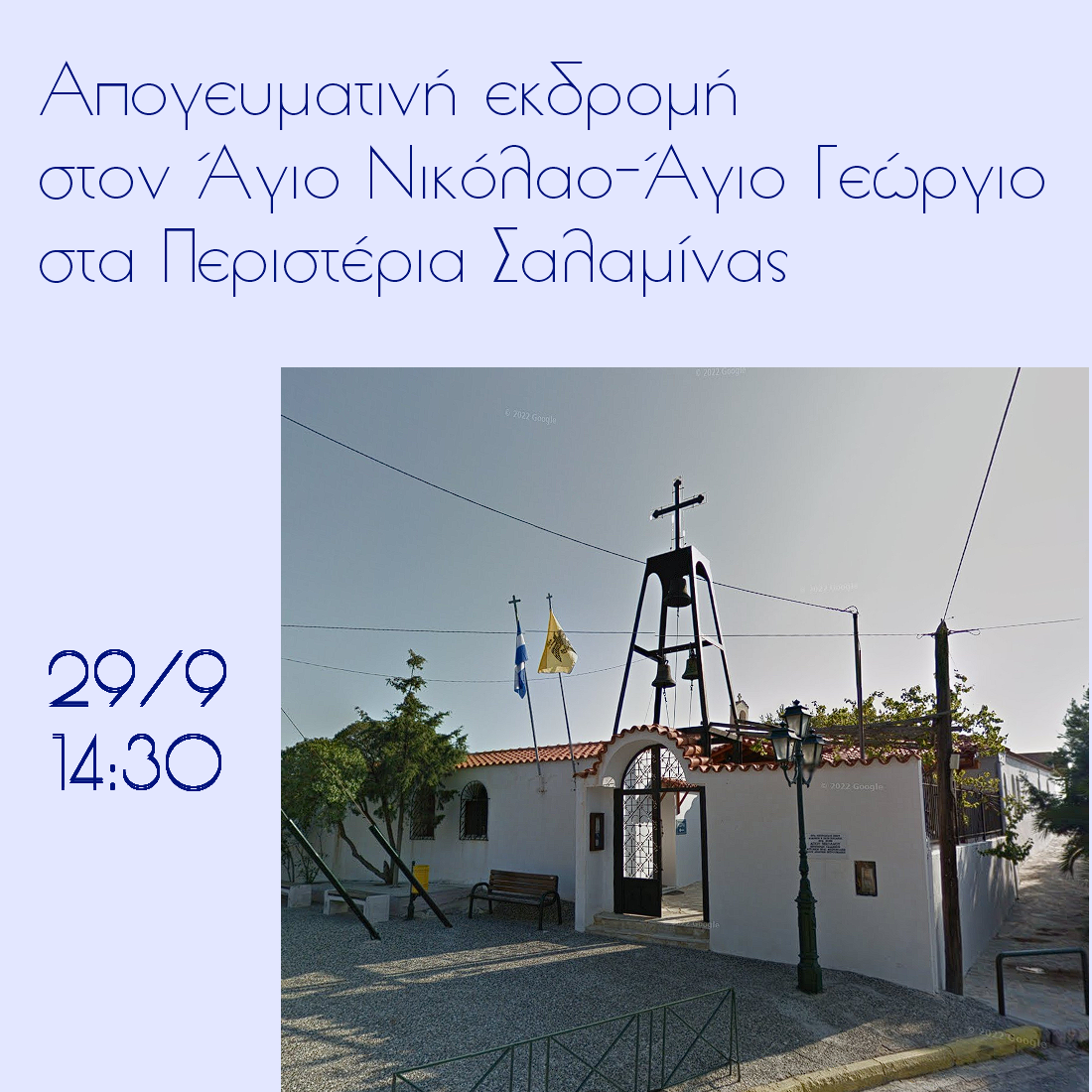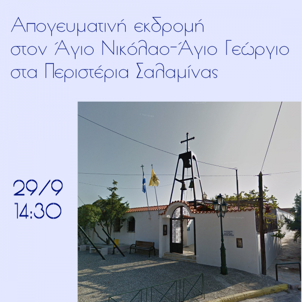 Η ενορία της Αγ. Βαρβάρας Ιλίου θα πραγματοποιήσει απογευματινή προσκυνηματική εκδρομή στο μετόχι του Αγίου Νικολάου και Αγίου Γεωργίου στα Περιστέρια Σαλαμίνας, όπου θα τελεστεί Ιερά Παράκληση και θα ακολουθήσει συζήτηση.