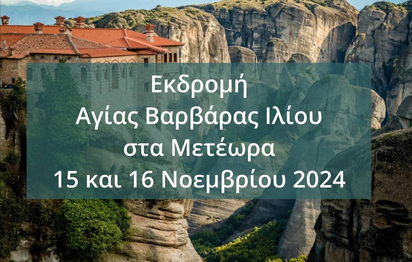 Διήμερη προσκυνηματική και ψυχαγωγική εκδρομή θα πραγματοποιήσει η ενορία της Αγίας Βαρβάρας Ιλίου στις Ιερές Μονές των Μετεώρων και την πόλη των Τρικάλων, στις 15 και 16 Νοεμβρίου 2024.