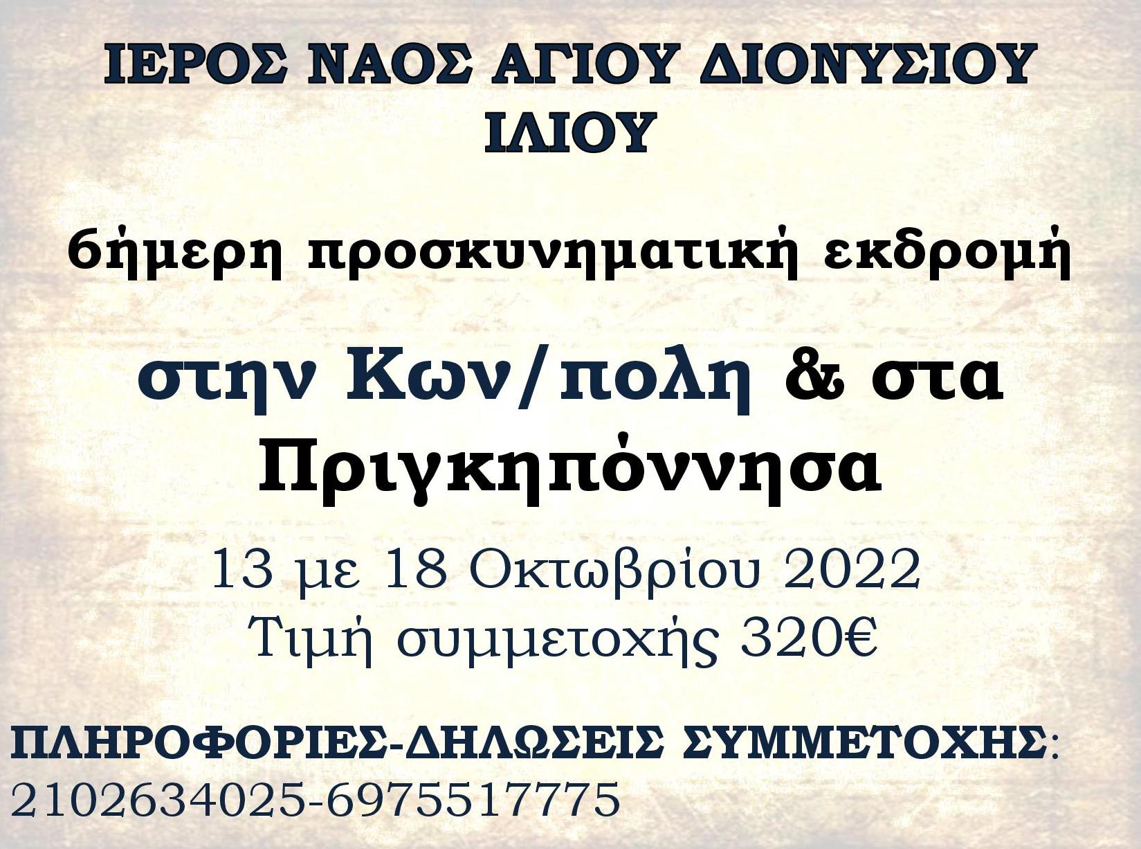 Εκδρομή στην Κωνσταντινούπολη και τα Πριγκηπόννησα διοργανώνει η ενορία Αγίου Διονυσίου Ιλίου από 13 έως 18 Οκτωβρίου 2022.