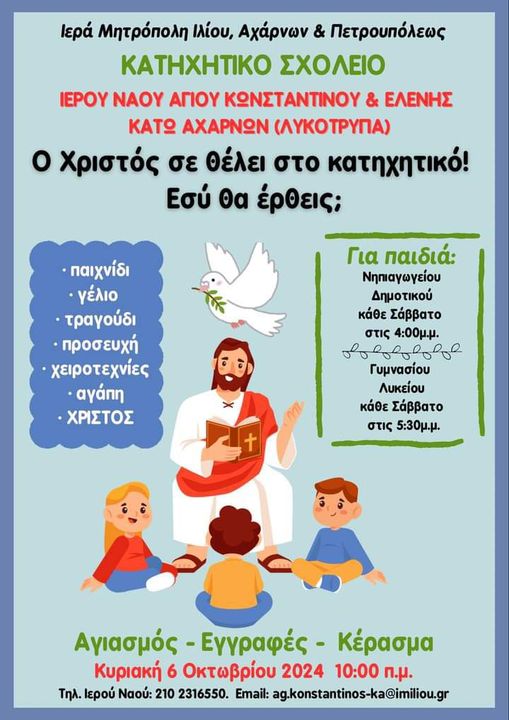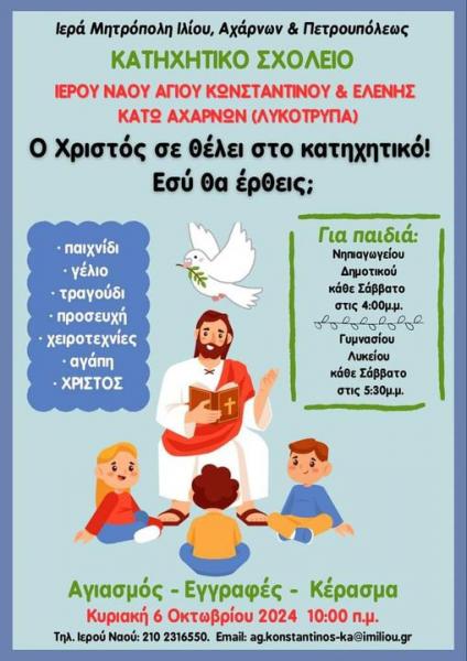 Αγιασμός και έναρξη κατηχητικών συνάξεων ενορίας Αγίων Κωνσταντίνου και Ελένης Κάτω Αχαρνών, Κυριακή 6 Οκτωβρίου 2024, στις 10:00.